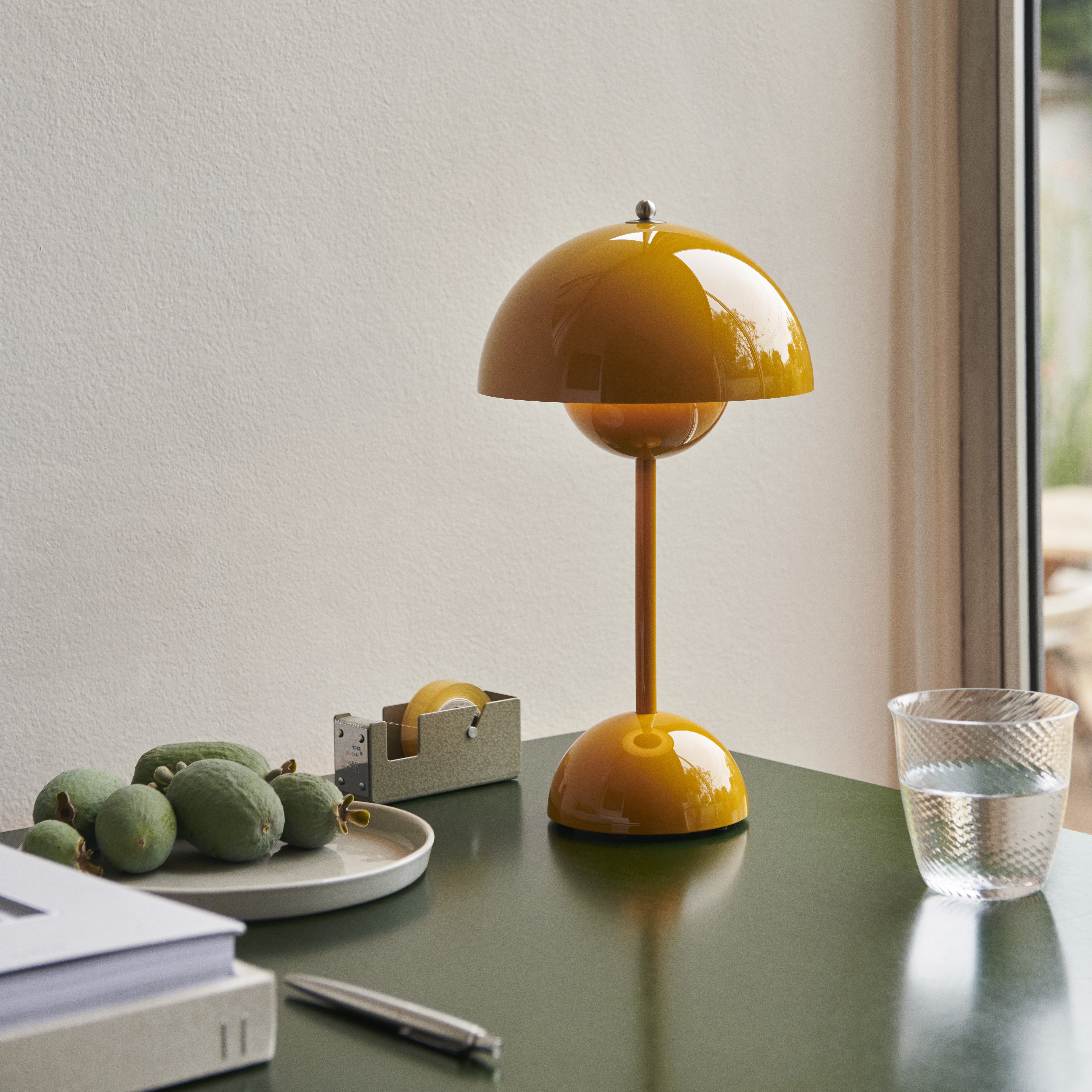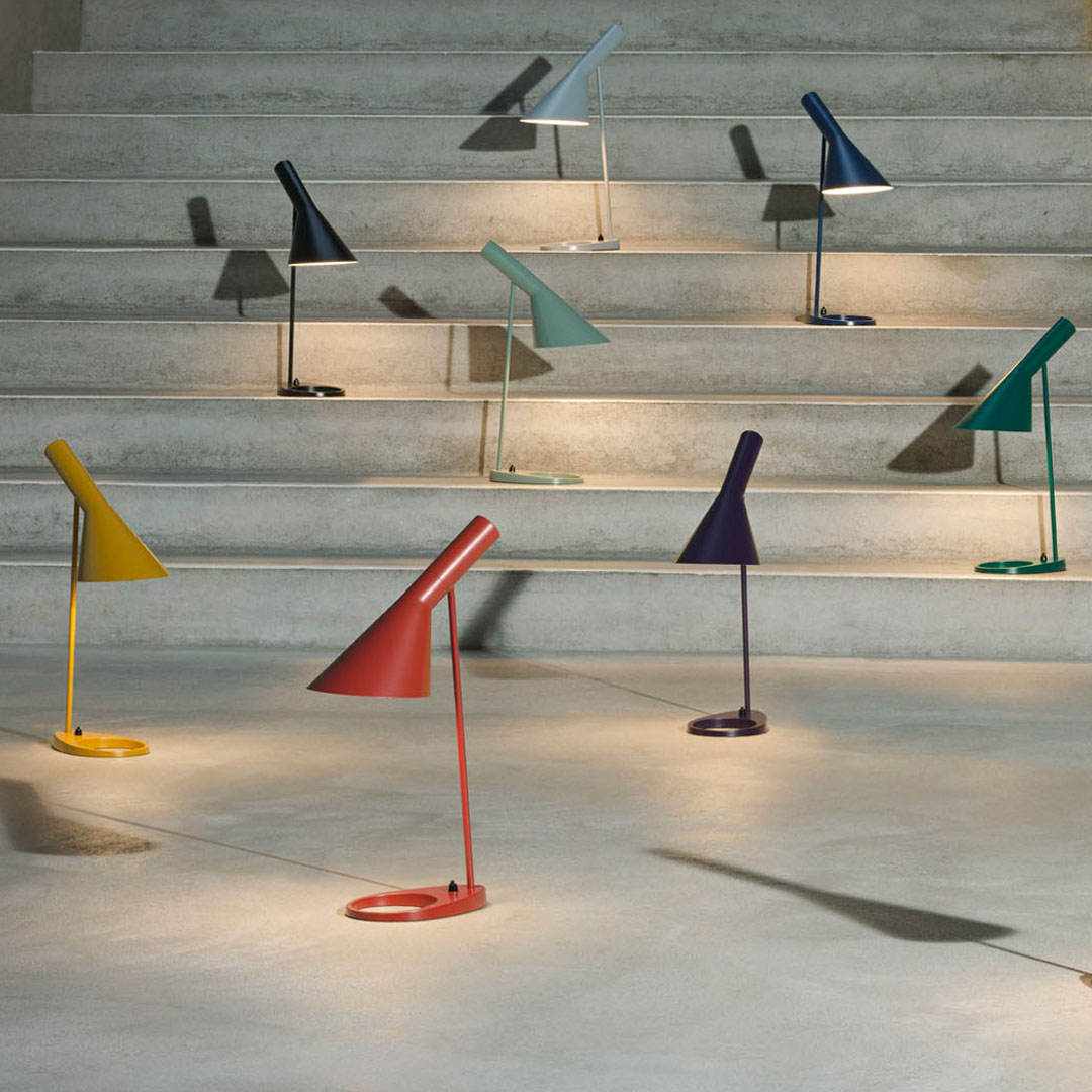 Modern och funktionell lampa i metall med matt lampfot och blank skärm. Finns i flera färger.