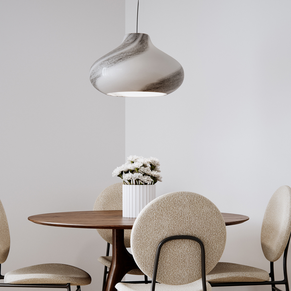 Stilfull och vacker glaspendel som sprider ett behagligt sken genom sitt opalglas. Finns i flera storlekar.