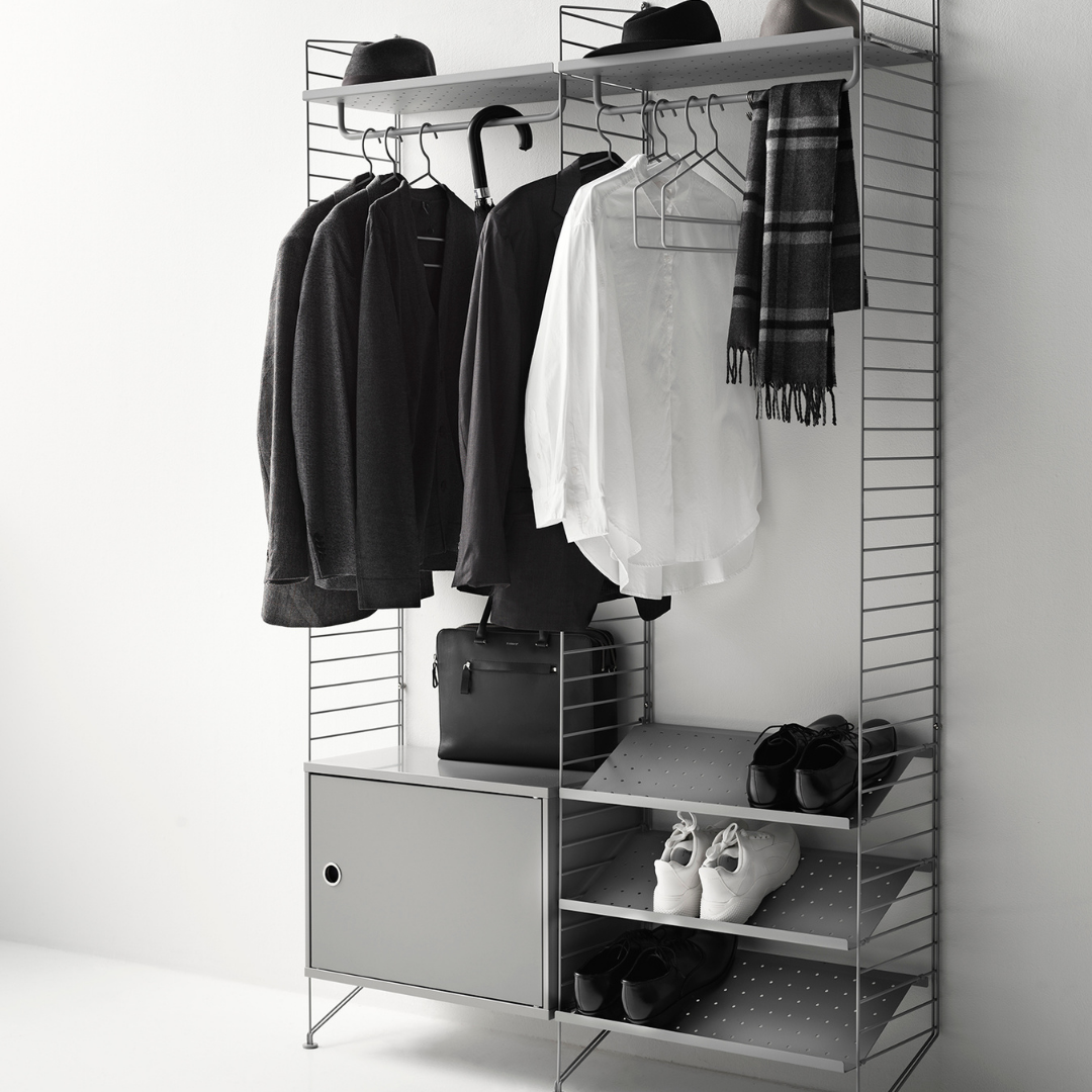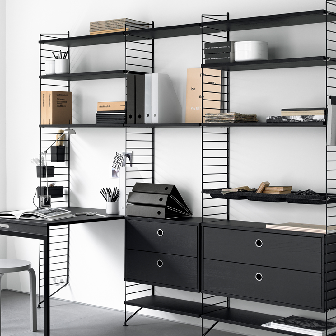 En String-hylla kan se ut och byggas på en mängd olika sätt - det är dina önskemål och din fantasi som sätter gränserna. Välj själv mellan luftiga hyllplan, skåp med lådor eller dörrar, arbetsskivor, tidsskriftshyllor och golv- eller väggavlar. String är helt enkelt uppbyggd av olika enkla moduler där du själv väljer utseende.